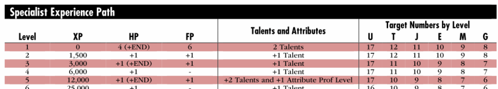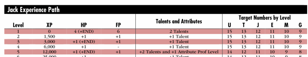 Ce sont ses deux tables qui pilotent la progression des personnages. Dans AJEM pas de progression selon les classes de persos. Le Jack ou le Specialist ont la même progression en points d’expérience, la même en HP et FP, et en talent et attributs. La différence se situe sur la valeur cible des compétences selon le niveau de maîtrise.