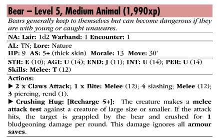 Les statblocks sont lisibles sans proposer une présentation originale. Chaque adversaire possède un niveau, une taille et un volume de points d’expérience. Le nombre d’apparitions est donnée en fonction soit du nid, soit de la troupe, soit de la rencontre aléatoire. Les compétences nécessaires pour connaître les particularités des créatures sont précisées tout comme l’alignement, le niveau de moral, les capacités spéciales, armes et armures.