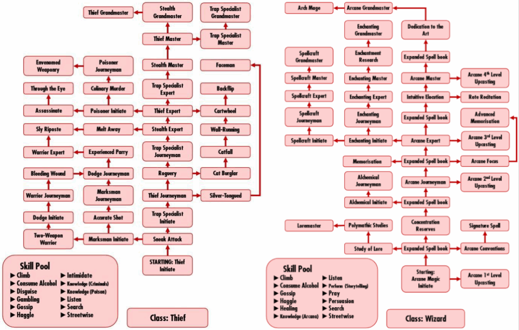 Les talents formalisent un multi-classage déguisé et puissant comme pour Mythcraft. Car les personnages sont libres de changer d’arbres de talents à leur guise en suivant le circuit des arbres de talents qui je le rappelle se fondent sur les héritages et les classes/professions. Voici la liste de ces dernières :
