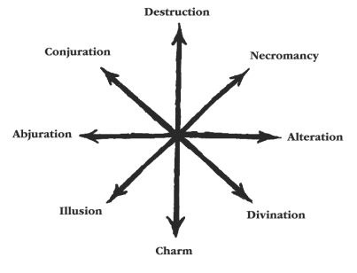 Huit écoles de magie sont présentées où l’on retrouve tous les classiques de l’OSR et de D&D.